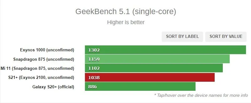 از طرفی اگزینوس 1000 در صدر این لیست قرار دارد و امتیاز بسیار خوبی را هم کسب کرده. گفته میشود این پردازنده از هستهی قدرتمند Cortex-X1 بهره میبرد که قرار است در اسنپدراگون 875 هم بهکار گرفته شود. البته ترتیب هستههای این دو پردازنده کاملا مشابه هست و هر دو مبتنی بر لیتوگرافی 5 نانومتری سامسونگ تولید میشوند.