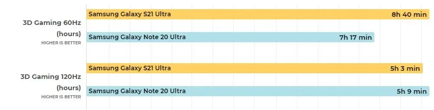 همانطور که مشاهده میکنید، در وبگردی، گلکسی S21 اولترا نه تنها نوت 20 اولترا بلکه به نظر میرسد تمام گوشیها را پشت سر میگذارد چرا که میتواند کمی بیشتر از 16 ساعت کاربران را همراهی کند و این بسیار فوقالعاده است. البته این میزان برای زمانی است که گوشی را روی رفرشریت 60 هرتز تنظیم کنید.
