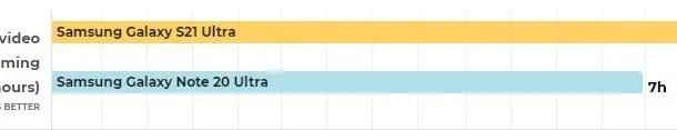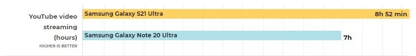 در بخش استریم ویدیو از یوتیوب که از رفرشریت 120 هرتز هم پشتیبانی نمیکند و گوشیهای سامسونگ معمولا عملکرد بسیار خوبی در این زمینه از خود به نمایش میگذارند، میبینیم که S21 اولترا حدودا 2 ساعت بیشتر دوام داشت و توانست 8 ساعت و 52 دقیقه کاربران را همراهی کند. در حالی که باتری نوت 20 اولترا تنها 7 ساعت شارژدهی داشت.