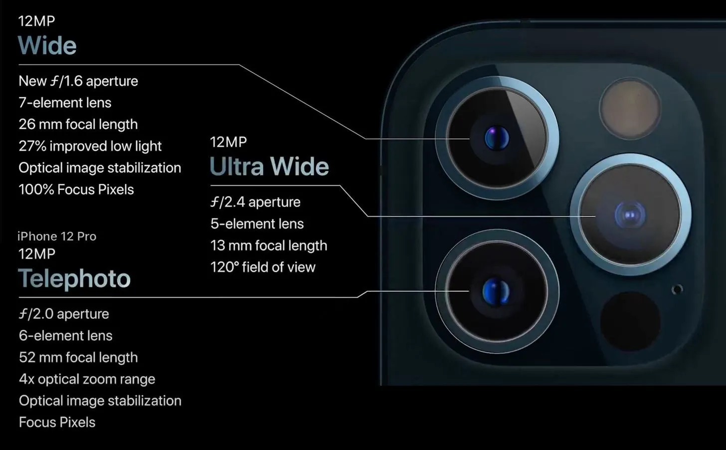 - آیفون 12 پرو: دوربین اصلی 12 مگاپیکسلی، تلهفوتوی 12 مگاپیکسل، فوق عریض 12 مگاپیکسلی، بهرهمندی از سنسور سهبعدی LiDAR