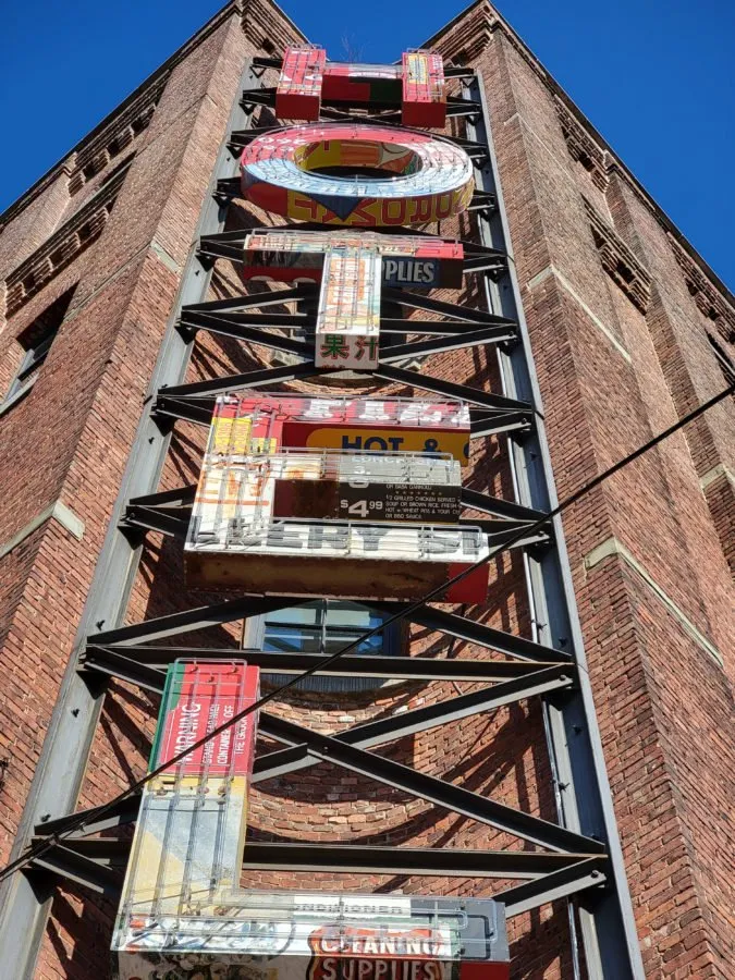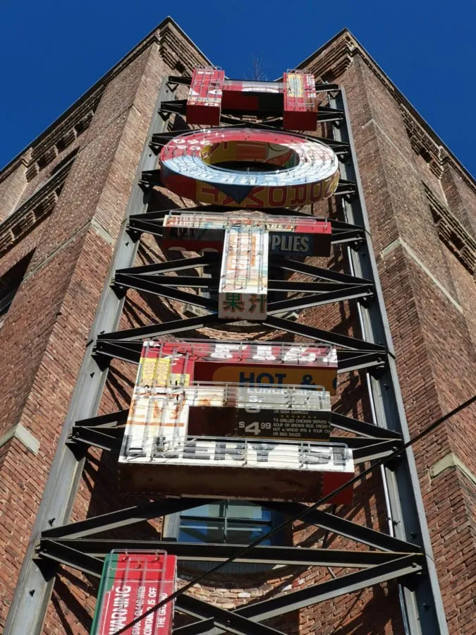 کافی است به نوشتهها نگاه کنید. برای مثال نوشتهی 31st Street در سمت راست، اعداد روی ستونهای فلزی و نوشتهی آبی رنگ زیر آنها و فروشگاه سمت چپ با لامپهای زرد رنگ کوچک. میبینید که گلکسی S21 اولترا واقعا در کنترل نقاط روشن و حفظ جزئیات مربوط به آن مشکل دارد که شاید به خاطر عملکرد نه چندان درست HDR باشد. در حالی که این مشکل در تصویر ثبت شدهی نمایندهی هواوی دیده نمیشود.