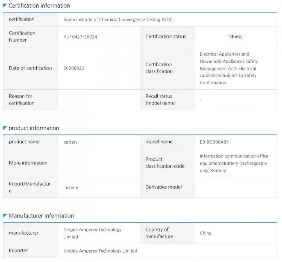البته این بار نه تنها اطلاعات مربوط به باتری بلکه تصویری از آن را هم در اختیار داریم که ظرفیت اسمی 4800 میلیآمپر ساعت را نشان میدهد. پیشتر در لیست 3C هم شاهد انتشار جزئیاتی از باتری گلکسی اس 21 پلاس بودیم که در آنجا ظرفیت باتری 4660 میلیآمپر ساعت نوشته شده بود. البته طبیعی است ظرفیت نوشته شده روی باتری کمتر از آن چیزی باشد که در لیست 3C شاهد هستیم. همچنین با توجه به تصاویر منتشر شده، گویا سازندهی باتری پرچمداران سری اس 21، شرکت چینی Ningde Amperex Technology خواهد بود.