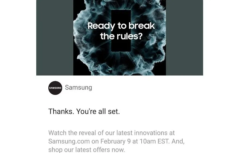 پس از تکمیل فرم پیش خرید، در یک پیام سامسونگ فاش کرد که طیف جدیدی از محصولات پیشرفته خود را در تاریخ 9 فوریه (20 بهمن ماه 1400) در ساعت 10 صبح به وقت محلی از طریق وبسایت خود رونمایی خواهد کرد. Samsung.com جایی است که سامسونگ معمولا پخش زنده رویداد سالانه Spring Unpacked خود را میزبانی میکند. در رویداد گلکسی آنپکد، سامسونگ قرار است گوشیهای پرچمدار جدید سری گلکسی S22 و تبلتهای پرچمدار سری گلکسی تب S8 را معرفی کند.