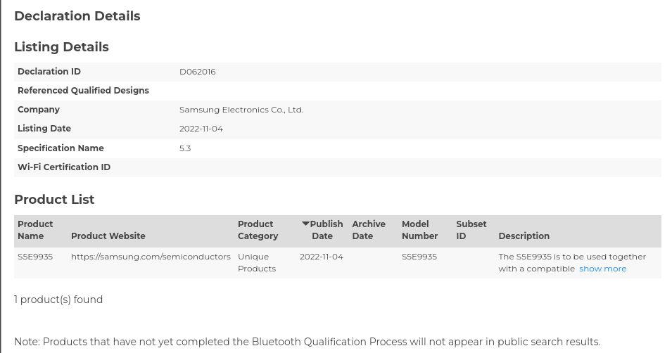 اینکه سامسونگ همچنان روی ساخت تراشهی یادشده کار میکند را از پایگاه داده بلوتوث متوجه شدهایم؛ جایی که تراشهای با شماره مدل S5E9935 که در واقع همان اگزینوس 2300 است اخیرا تأییدهی دریافت کرده. البته هنگام دریافت تأییدهی بلوتوث هیچ اطلاعات خاص دیگری از یک محصول افشا نمیشود، در نتیجه اصلا از این بابت که اگزینوس 2300 چه تعداد هسته و چه قابلیتهایی خواهد داشت بیخبریم. تنها چیزی که میدانیم این است که این تراشه از بلوتوث 5.3 پشتیبانی میکند.