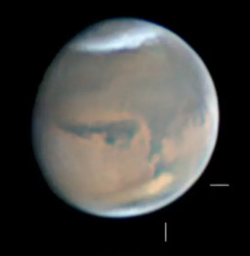 در نیمکرهی شمالی مریخ که زمستان است، کلاهک قطب شمال (North Polar Cap) را یک ابر گسترده پوشانده و دیده نمیشود اما این ابر به صورت یک مه آبی-سفید محو، در قطب شمال مریخ دیده میشود.