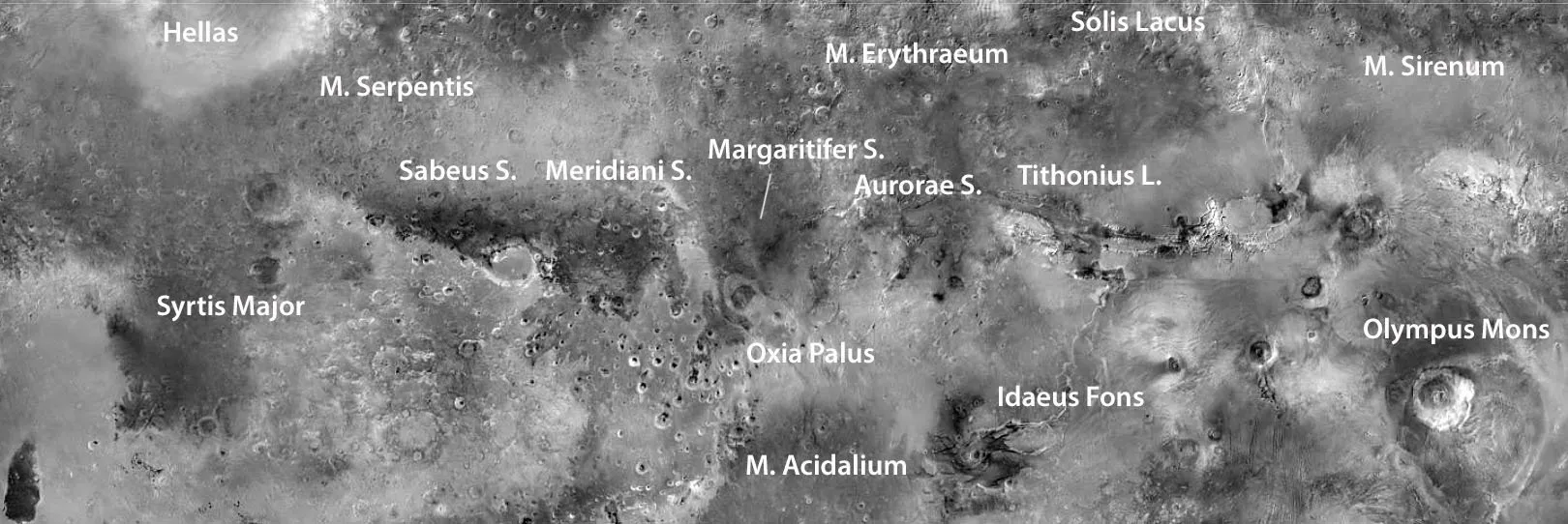 «دریای سیرنام» (Sirenum) ما را به سمت «دریاچهی خورشید» (Solis Lacus) هدایت میکند که یک قطعهی دایرهای خاکستری و مدور است که با فلاتهی کمرنگ «تاماسیا» (Thaumasia) دربر گرفته شده است. با رفتن به سمت غرب، منطقهی تاریک و لکهدار «دریای اریتریوم» (Erythraeum) آغاز میشود و از آنجا به صورت دو شکل چنگال-مانند ادامه مییابد؛ «خلیجوار شفق قطبی» (Aurorae Sinus) و «خلیجوار مارگاریتیفایر» (Margaritifer Sinus). دومی به زیبایی با عوارض زیبای Oxia Palus درمیآمیزد و نمونهی کمرنگتری از سیرت بزرگ ایجاد میکند.