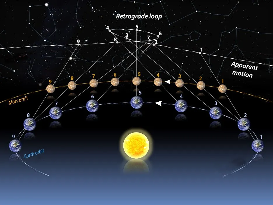 یکی از نکات جالب برای رصد دقیق، دیدن چرخش سیاره به عقب در شبهای متوالی است. مریخ مانند دیگر سیارهها، از شرق به غرب میچرخد اما به دلیل اینکه هر 24٫6 ساعت یک بار میگردد و سرعت گردش آن کاملا بر سرعت گردش زمین به دور خودش منطبق نیست، ویژگیهای سطحی آن هر شب به آرامی 9٫5 درجهی جغرافیایی روی سطح آن به سمت شرق حرکت میکنند.