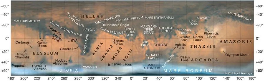 پیش از نگاه به مریخ، خوب است بدانید که به کدام سمت مریخ نگاه میکنید. روی این سیاره هم درست مانند زمین طول و عرض جغرافیایی، موقعیت عوارض را مشخص میکند. برای اینکه بدانید کجا را میبینید، میتوانید از شبیهساز منظومهی خورشیدی ناسا یا برنامهی مارس پروفایلر اسکایاندتلسکوپ استفاده کنید.
