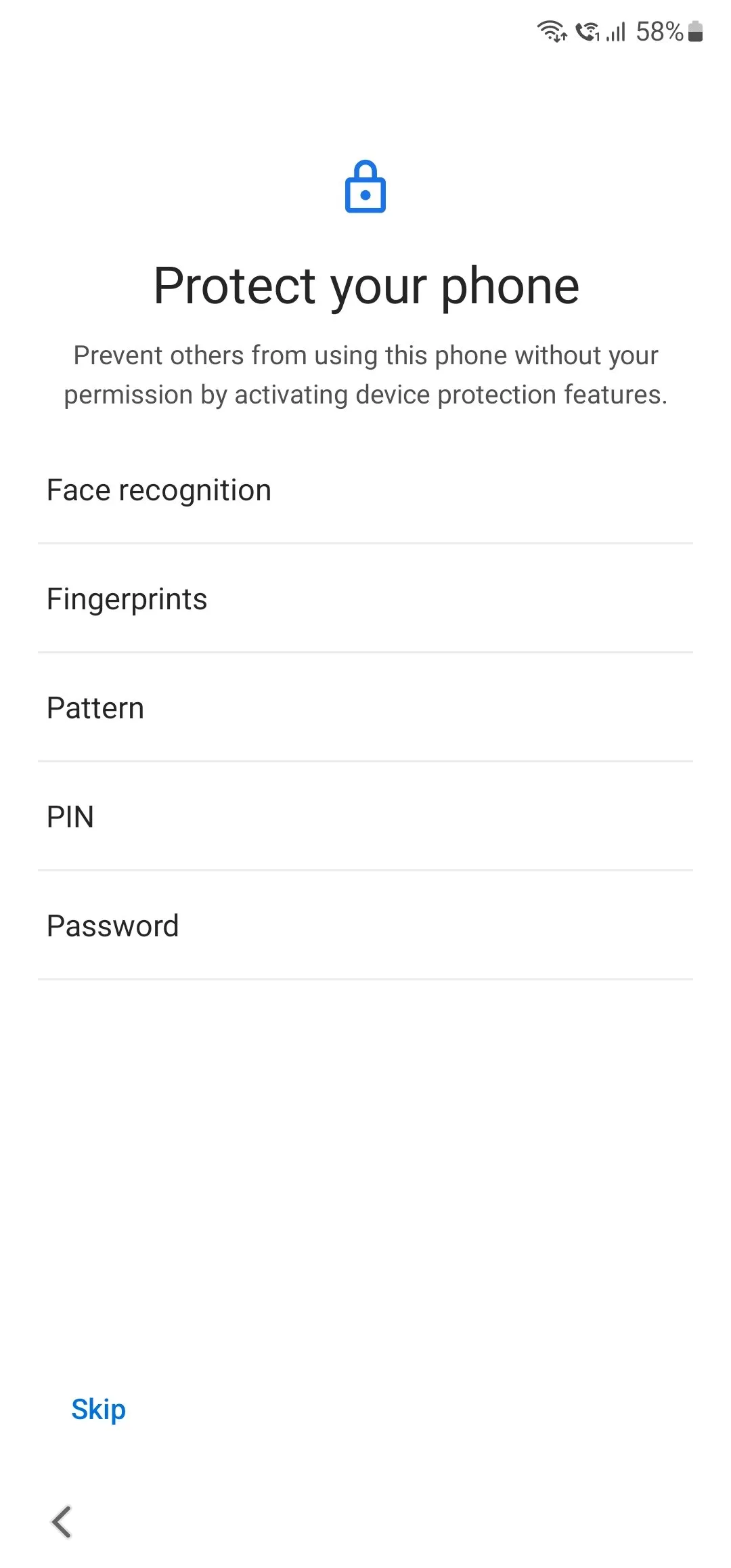 در این بخش از راه اندازی گوشی سامسونگ، لازم است تا شما برای گوشی سامسونگ جدید خود یک قفل امنیتی در نظر بگیرید تا امنیت آن را افزایش دهید. نوع قفلهای موجود برای گوشی سامسونگ شما بستگی به مدل و امکانات دستگاه دارد؛ برای مثال، برخی از مدلها ممکن است حسگر اثر انگشت نداشته باشند یا از قابلیت شناسایی چهره پشتیبانی نکنند. در هر صورت، با انتخاب گزینه Skip، میتوانید بدون تنظیم قفل به مرحله بعد بروید.
