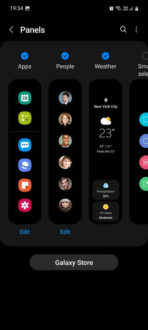 به کمک این پنل میتوانید به اپهای محبوب (حداکثر ۲۲ اپ) دسترسی پیدا کنید. برای تغییر چینش اپهایی که در این پنل قرار میدهید میتوانید از منوی همبرگری و سپس گزینهی Edit استفاده کنید. برای چینش پنلهای جدید که دسترسی به ابزارهای مختلف را ممکن میکنند هم میتوانید با ورود به همان بخش Edge Panels که در تنظیمات وجود داشت ابزارهای کاربردی مورد نظر خود را انتخاب یا از طریق فروشگاه Galaxy Apps آنها را دانلود کنید.