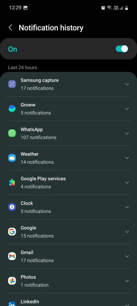 - برای دیدن اعلانهای دریافتی از یک اپ خاص در ۲۴ ساعت گذشته، در همان Notification history، آیکن مربوط به منوی کشویی که در کنار نام اپ قرار دارد را انتخاب کنید. توجه داشته باشید پیش از نمایش اعلانهای ۲۴ ساعت گذشته، بخشی نمایش داده میشود که به اعلانهایی که به تازگی از دست دادهاید مربوط است.