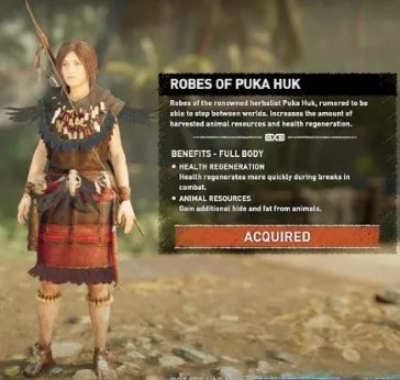 از جمله لباسهای بعدیاش مثلا Three Fangs Tunic است، ساخته شده از پوست آناکوندایی که میکشد، و همینطور Ozcollo’s Tunic، که بازی از آن بهعنوان «لباس جگوار افسانهای Ozcollo» نام میبرد، یعنی «توتم و اولین قهرمان راه جگوار». این تصویرهای «توتمی» از بومیها و تصاحب آن از طرف اروپاییها — و ایضا «مرگ» این توتم نمادین جگوار و پوشیدن پوست آن — را در خصوص لباس Robes of Puka Huk هم میبینیم: «ردای Puka Huk، عطار برجسته، که بنا به شایعات میتوانست بین جهانهای مختلف طیالارض کند». نه فقط لارا ملبس به جامههای «بومی» است، بلکه میتواند (انگار که مثلا خودش هم بومی باشد) از نیروی نهفته در همین لباسها به نفع خود استفاده کند، مثلا زودتر زخمهایش مداوا شود یا در استفاده از گوشت و پوست حیوانات ماهرتر شود. این مفهوم را در تمدنهای پیشا-کلمبیایی میبینیم که در آن جامهها و زیورآلات «حکم سمبلی را داشتند که اگر شخصی آنها را میپوشید، از طریق مناسکهای مذهبی و همینطور جادوها نیرویی رازآلود به دست میآورد» و با بهارث بردن ویژگیهایش دگرگون میشد.