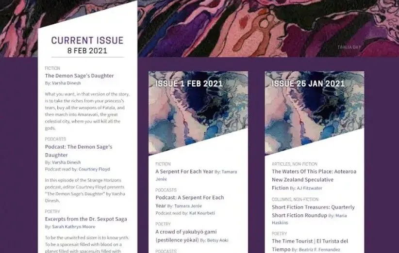 وبسایت Strange Horizons خود را به عنوان مجلهای از داستانهای تخیلی توصیف میکند که معنی آن برای شما به عنوان یک خواننده این است که انواع داستانها را، صرف نظر از اینکه در کدام زیر مجموعه قرار میگیرند، پیدا خواهید کرد. داستانهای این مجله به صورت هفتگی منتشر خواهند شد، بنابراین شما میتوانید در طول هفته مطالب بسیار زیادی را از این مجلهی آنلاین دریافت کنید. همچنین روشهای مختلفی برای دسترسی به داستانهای این وبسایت وجود دارد. شما قادر خواهید بود تا داستانهای مورد علاقهی خود را به صورت نسخههای متنی و پادکست دریافت کنید.