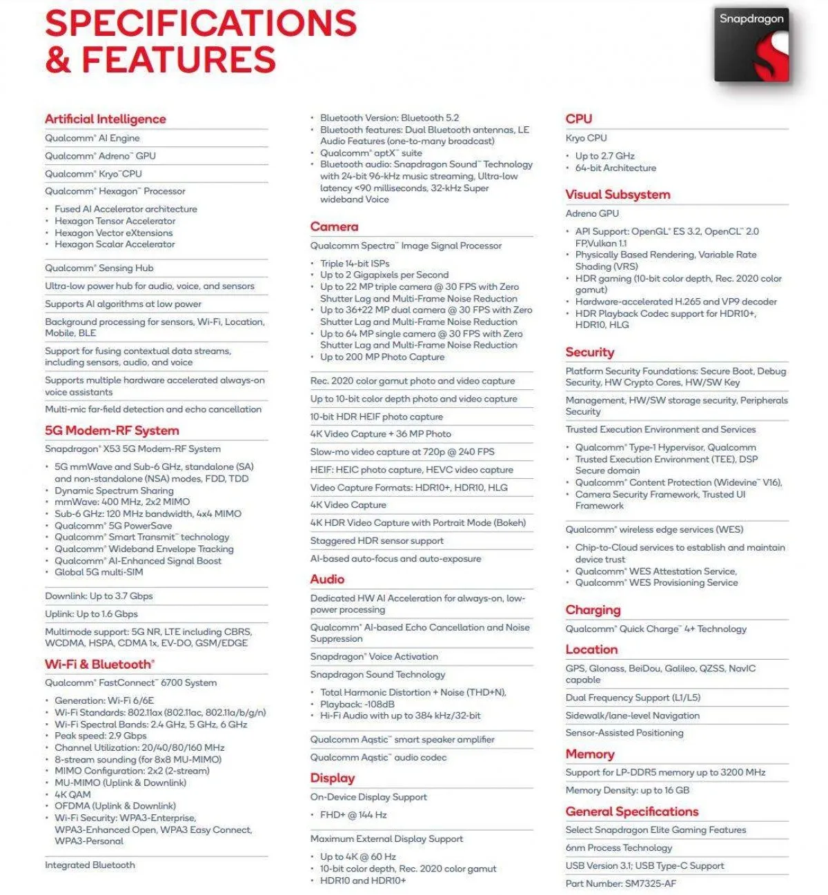 مودم اسنپدراگون X53 بکار رفته در این پردازنده توانایی پشتیبانی از اینترنت 5G را داراست و اگرچه با یک میانرده طرف هستیم اما با این حال هم از فرکانس زیر 6 گیگاهرتز پشتیبانی میکند و هم طول موج میلیمتری. همچنین به لطف قابلیت FastConnect 6700، شاهد پشتیبانی از وایفای 6 با سرعت 2٫9 گیگابیت بر ثانیه هم هستیم.