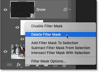 در آموزش ایجاد افکت بارش برف در فتوشاپ، ما احتیاجی به ماسک فیلتر نداریم. بنابراین آن را حذف میکنیم تا در پنل لایهها فضای اضافی اشغال نکند.