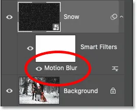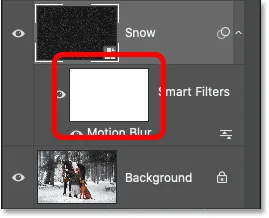 از آنجایی که فیلتر Motion Blur را روی یک Smart Object اعمال کرده بودیم، فتوشاپ آن را تبدیل به یک فیلتر هوشمند (Smart Filter) میکند. فیلترهای هوشمند در پنل لایهها، زیر لایهی Smart Object لیست میشوند.
