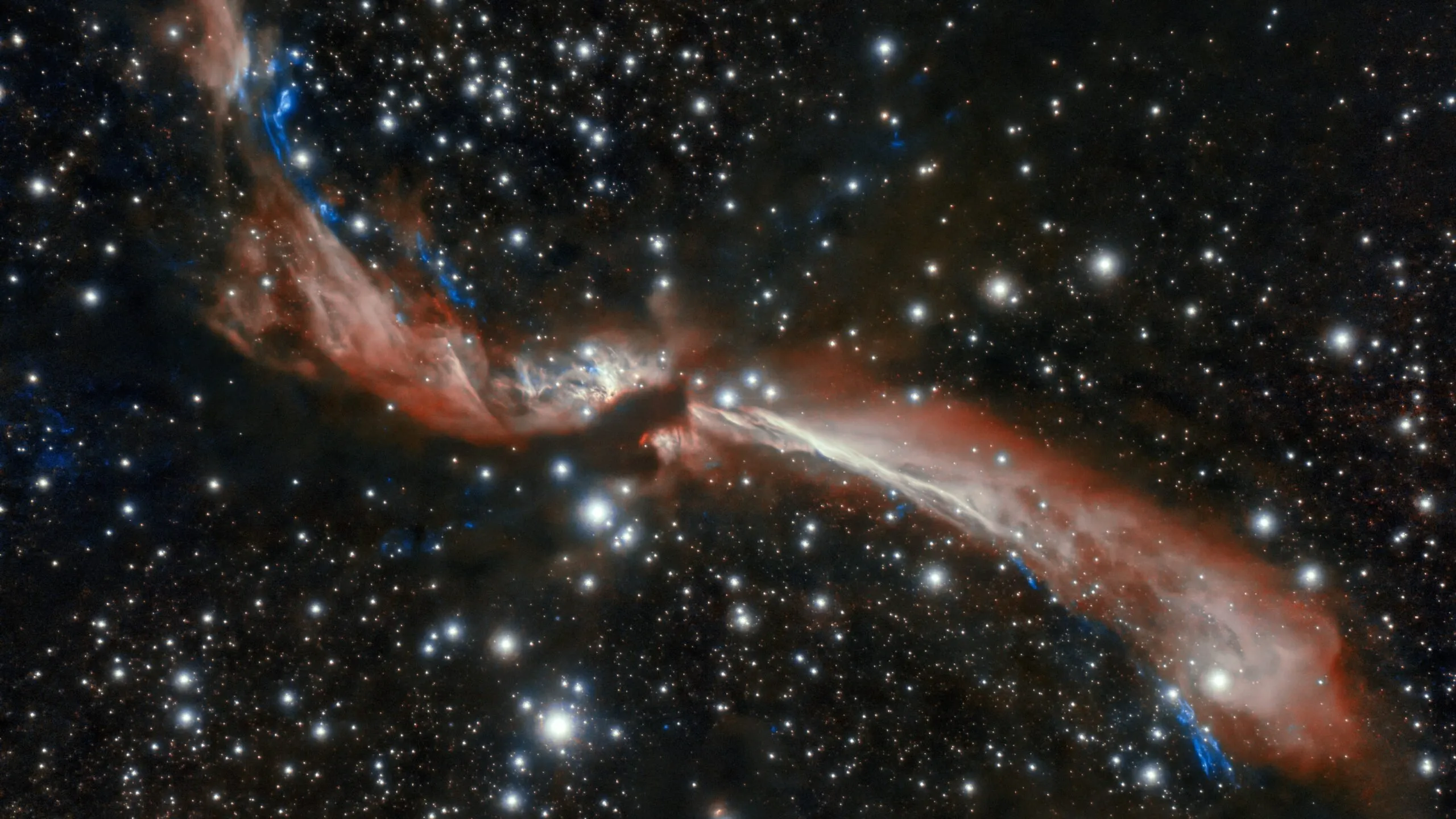 در عکسهای تازه و خیرهکننده از تلسکوپ جمنای جنوب در شیلی، ستارههای جوان جتهای ستارهای قدرتمندی را پرتاب میکنند که احتمالا بر اثر گرانش عظیم دچار انحنای اندکی شدهاند.