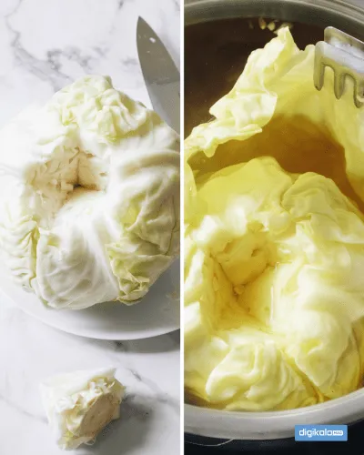 مانند تصویر قسمت انتهایی کلم را برش بزنید و جدا کنید. سپس در یک قابلمهی بزرگ آب را جوش بیاورید، کمی نمک و زردچوبه در آن بریزید و کلم را در آن قرار دهید. بعد از 10 دقیقه جوشیدن برگهای کلم را به آرامی جدا کنید و در آبکش بگذارید.