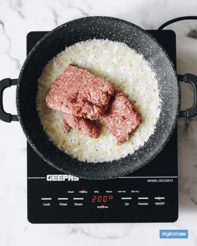 پیاز خرد شده را در روغن تفت دهید. زمانی که پیاز طلائی شد، گوشت چرخکردده را به آن اضافه کنید و با هم تفت دهید.