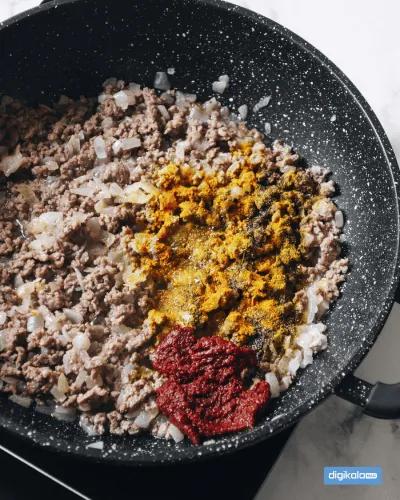 بعد از تفت خوردن گوشت، 1 قاشق رب گوجه فرنگی و ادویهها را به آن اضافه کنید.