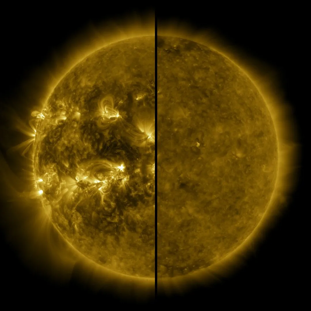 مقایسهی اوج فعالیت خورشیدی در سال 2014 (سمت چپ) و حالت آرام فعالیت خورشید در سال 2019 (سمت راست)