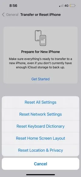 کافی است به تنظیمات رفته و در بخش General و بعد Transfer or Reset iPhone و سپس Reset و در نهایت Reset Network Settings، تنظیمات شبکه را ریست کنید. در این قسمت باید حتما رمز عبور گوشی را وارد کنید تا به شما اجازهی ریست کردن تنظیمات داده شود.