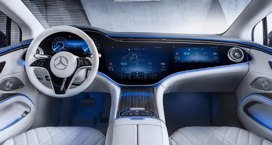 شما میتوانید رنگ بدنهی این خودرو را هم به صورت تک رنگ و هم به صورت دو رنگ سفاش دهید. نورپردازی داخلی EQS بسیار هوشمندانه و زیبا طراحی شده که در کنار یک صفحه نمایش 56 اینچی همه چیز را برای لذت بردن شما از رانندگی فراهم کند. البته که این صفحه نمایش 56 اینچی از 3 نمایشگر جداگانه تشکیل شده است تا حس رانندگی در یک سفینهی فضایی را به شما القا کند. روکشهای چرمی صندلیها نیز به هیچ توضیح اضافهای نیاز ندارد؛ چرا که از بهترین چرم موجود ساخته شدهاند.