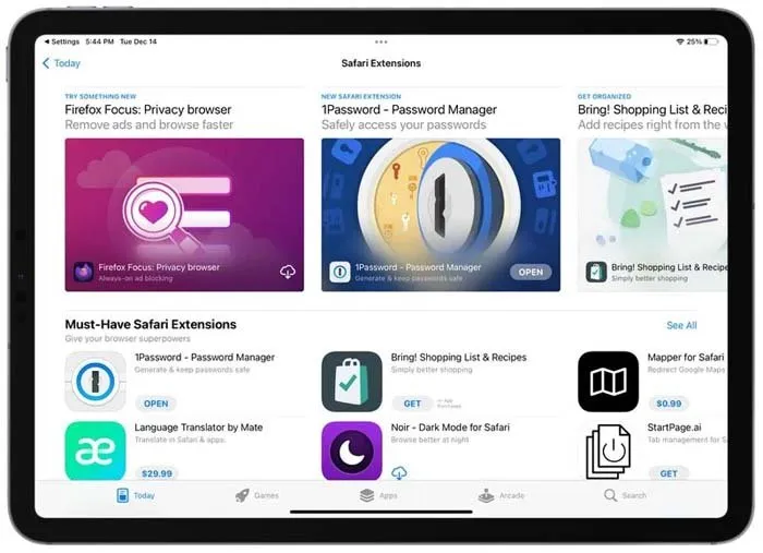 نسخهی آیپد سافاری از افزونههای زیادی پشتیبانی میکند که با بهرهگیری از آنها، میتوانید از امکانات بیشتری نسبت به حالت معمول بهرهمند شوید. برای دسترسی به این افزونهها باید راهی بخش Settings سیستمعامل شوید و سپس بعد از مراجعه به قسمت Safari، روی Extensions ضربه بزنید و پس از انتخاب More، از اپ استور میتوانید افزونههای مختلفی را دریافت کنید.