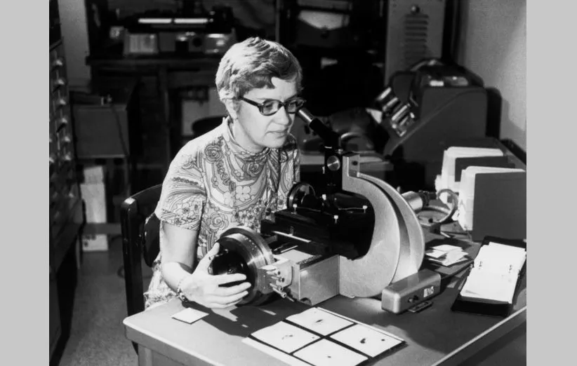 جیمز واتسون (سمت چپ) و فرانسیس کریک، با تصویر اشعه ایکسی که روزالیند فرانکلین گرفته بود، ساختار دوگانه و مارپیچی DNA را کشف کردند.