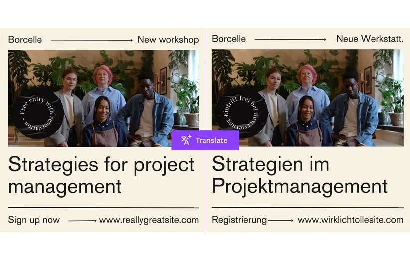 اپلیکیشن کانوا، Magic Translateرا به عنوان بخشی از کتابخانه ابزار هوش مصنوعی خود در سال ۲۰۲۳ معرفی کرد. استفاده از هوش مصنوعی برای ترجمهی طرحها میتواند در زمان و هزینه شما در هنگام ایجاد طرحهای چند زبانه صرفهجویی کند. با این حال، همیشه باید نتایج را با یک زبان مادری بررسی کنید تا مطمئن شوید که ترجمهی پیام درستی را ارسال میکند.