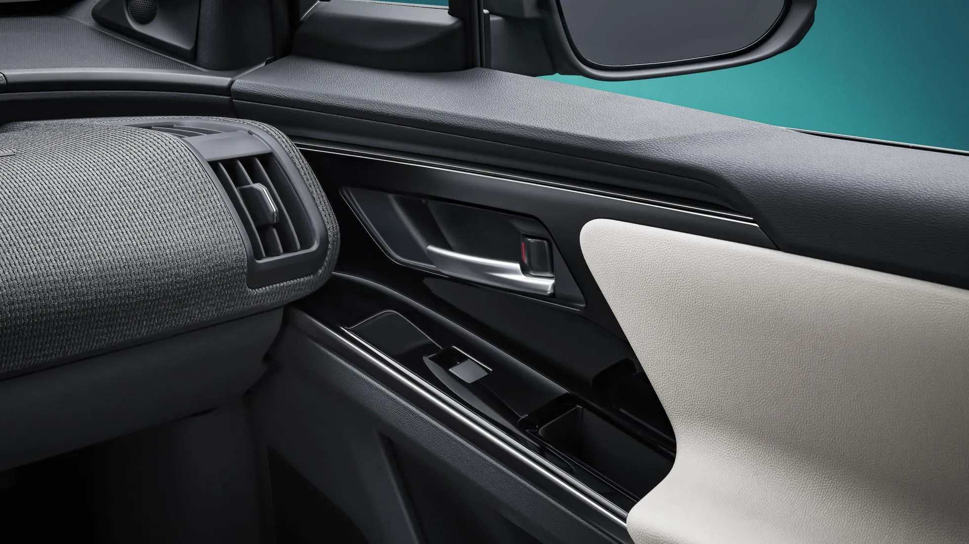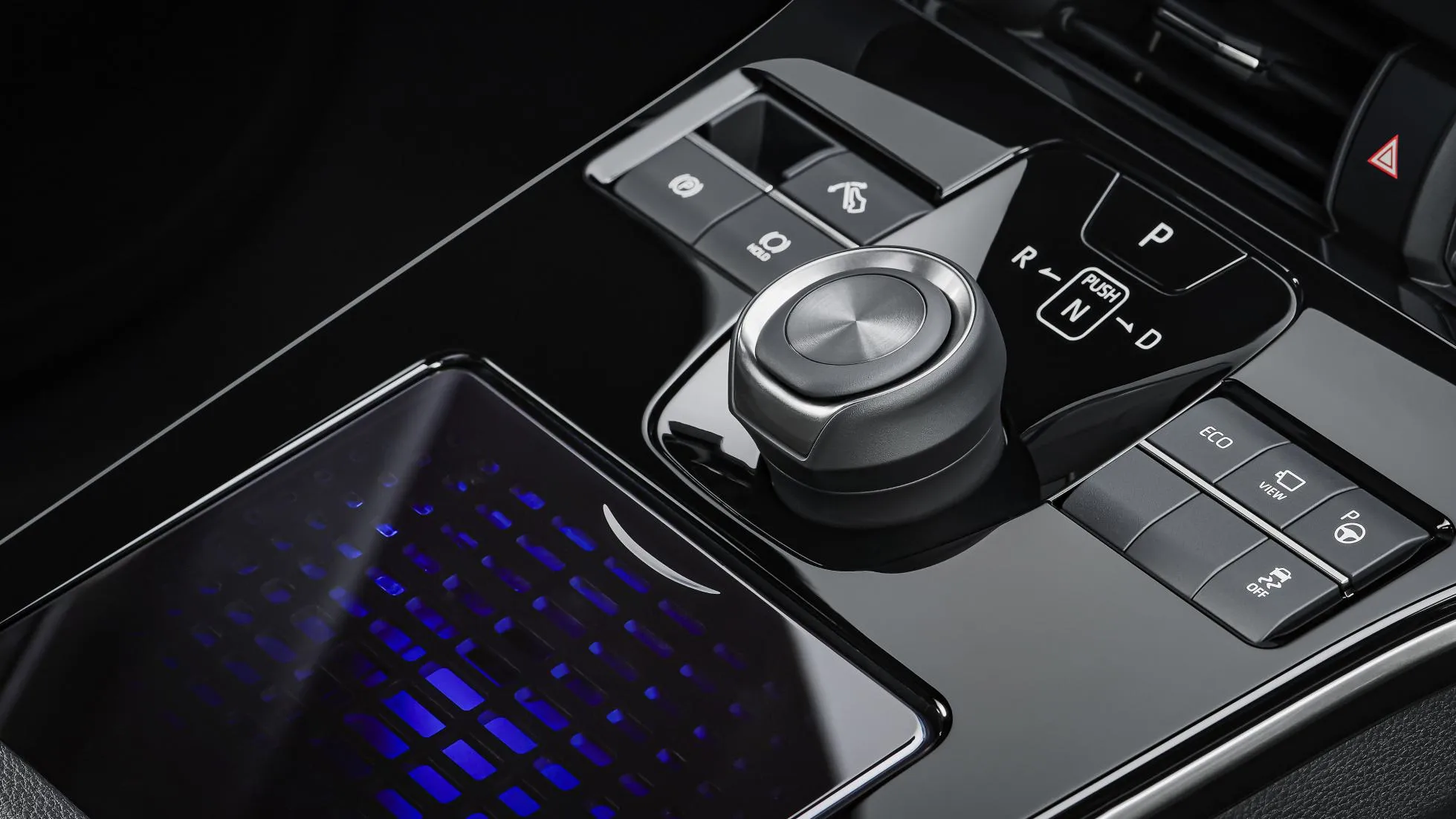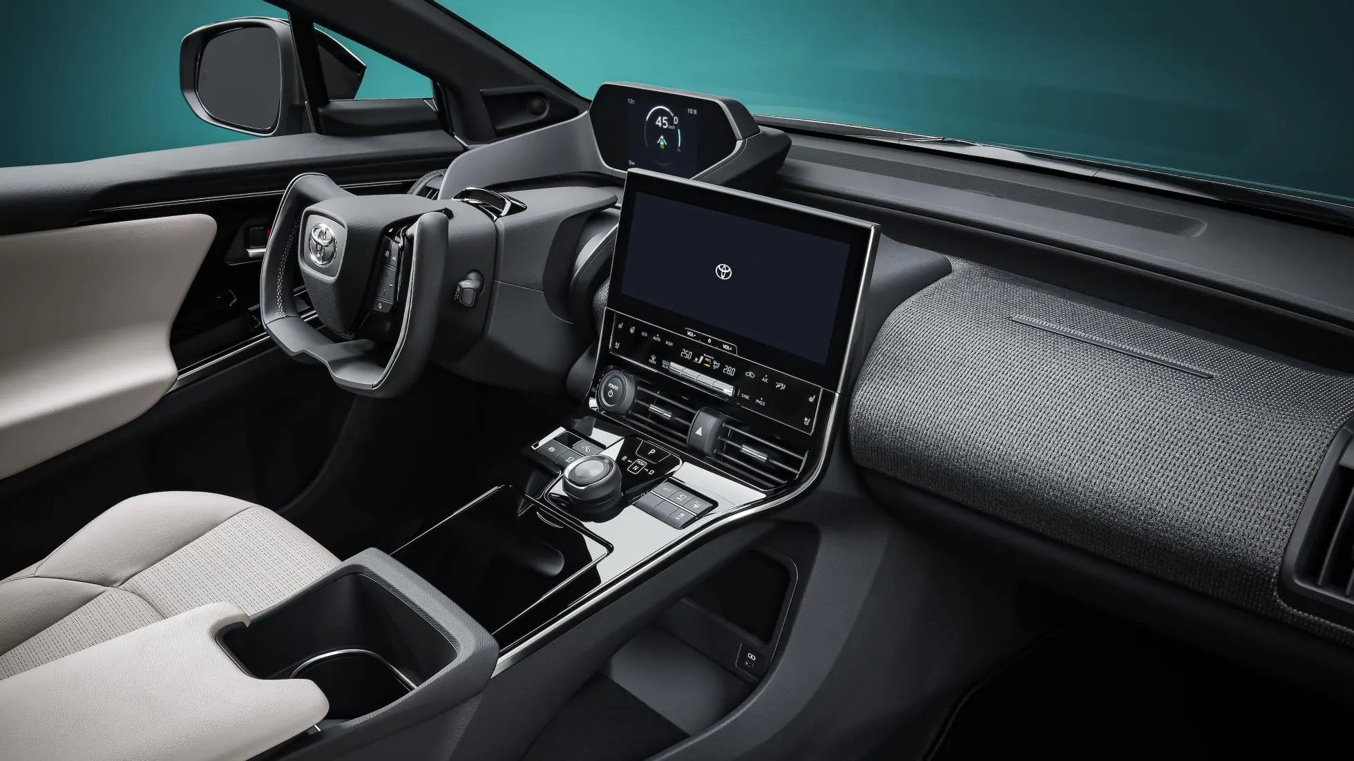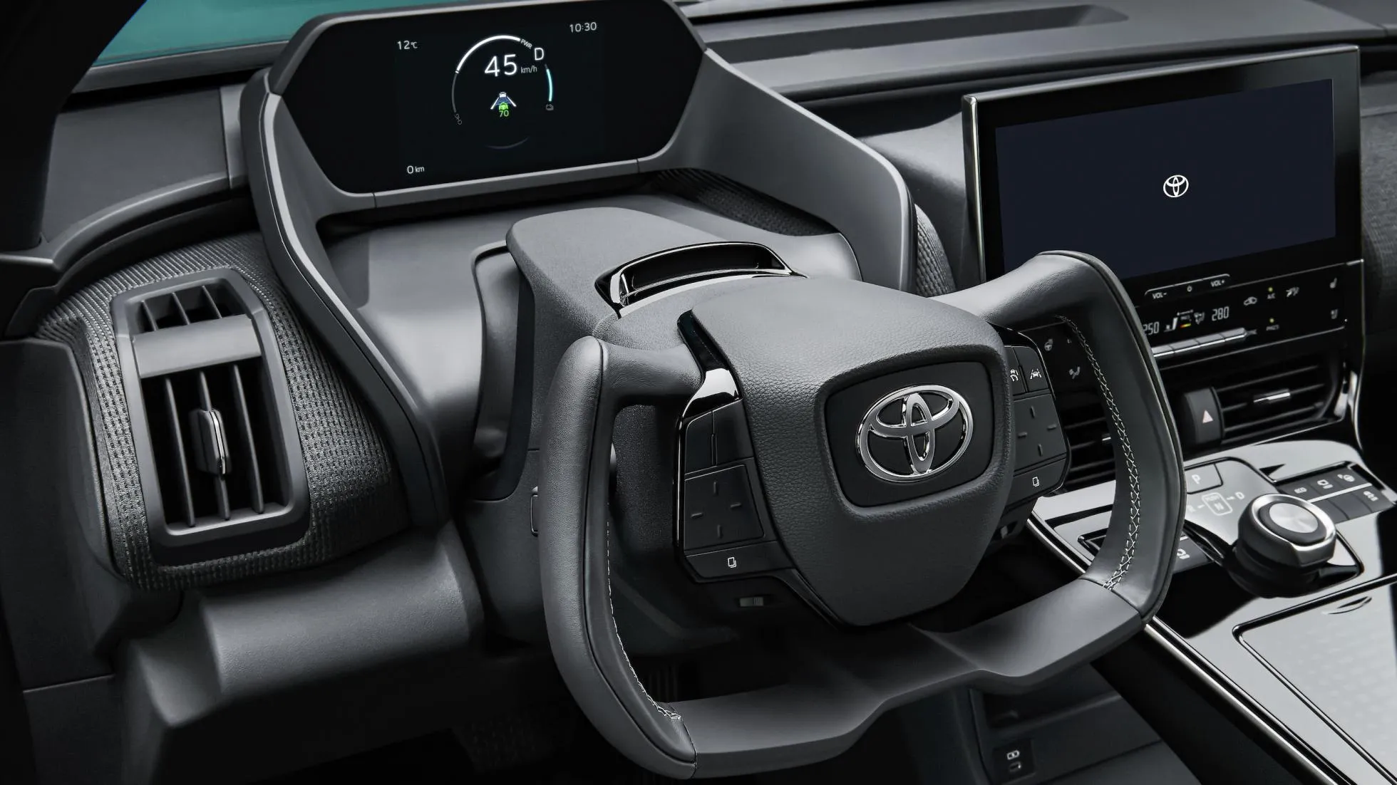 در کابین داخلی تویوتا bZ4X فرمان اسپرت، نمایشگر مرکزی سیستم اطلاعرسانی و سرگرمی، خوشه ابزار دیجیتال راننده و کلیدهای تنظیم دندهی اتوماتیک به چشم میخورد.