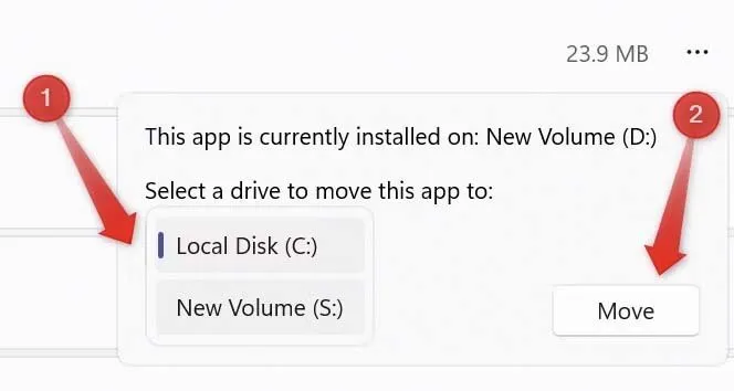با این کار، ویندوز محل نصب فعلی برنامه را نشان میدهد و درایوهایی که میتوانید به آنها انتقال دهید هم نمایش داده میشود. بعد از مشخص کردن درایو مقصد، کافیست روی گزینهی Move کلیک کنید.