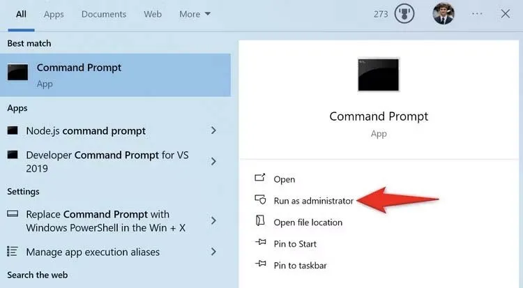بعد از مشخص کردن مبدا و مقصد برنامه، حالا وقت آن است که سراغ Command Prompt بروید. برای این کار کافی است بعد از باز کردن منوی استارت، بنویسید Command Prompt و بر روی گزینهی Run as Administrator کلیک کنید تا این محیط با دسترسی ادمین اجرا شود.