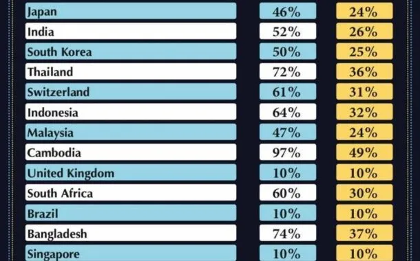 - در ستون دوم درصد تعرفههایی را میبینیم که هر کشور بر کالاهای وارداتی از ایالات متحده اعمال کرده است. این ارقام بیانگر میزان سختگیری تجاری آن کشور در قبال محصولات آمریکایی هستند.