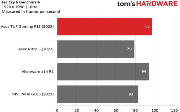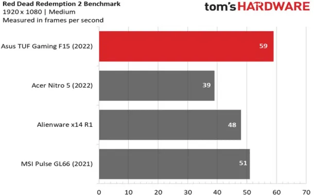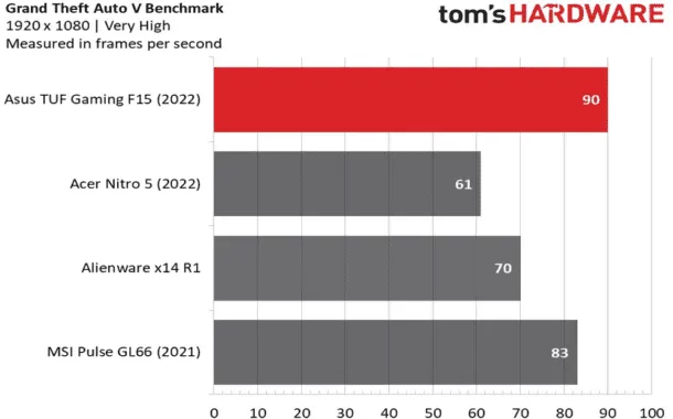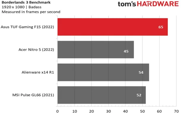 در جریان بنچمارکها برای بازی GTA V، لپتاپ TUF Gaming F15 توانسته نرخ فریم فوقالعادهی ۹۰ را کسب کند. این موضوع در حالی است که سایر رقبای این محصول نرخ فریم پایینتری را داشتهاند. در اجرای بازی Borderlands 3 هم لپتاپ TUF Gaming F15 موفق شده نرخ فریم بسیار عالی ۶۵ را در بالاترین تنظیمات ممکن به دنبال داشته باشد. سایر لپتاپها به زحمت توانسته بودند نرخ فریم ۵۰ را کسب کنند.