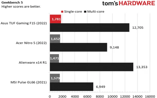 در تست Geekbench 5.4 این لپتاپ توانسته امتیاز ۱۷۸۱ را در بحث تک هسته و ۱۲۷۰۵ را در بحث چند هسته کسب کند. لپتاپ Alienware x14 R1 در تست تک هسته و چند هسته به ترتیب امتیاز ۱۴۷۱ و ۱۳۳۵۳ را توانسته به دست آورد. لپتاپ ایسر نیترو ۵ و لپتاپ MSI Pulse GL66 هم موفق شدهاند تا امتیازهای قابل توجهی را کسب کنند.