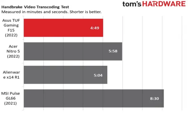 در جریان تست هندبریک، لپتاپ TUF Gaming F15 سریعترین ترنسکد یک ویدیوی 4K را به 1080p انجام داده و عدد ۴ دقیقه و ۴۹ ثانیه برای این لپتاپ میانرده رقم بسیار حائز اهمیتی است. لپتاپ Alienware با ۵:۰۴ و ایسر نیترو ۵ با ۵:۵۸ و همچنین لپتاپ Pulse GL66 ۸:۳۰ چند قدم عقبتر از رقیب قدرتمندِ خود در رتبههای بعدی قرار میگیرند.