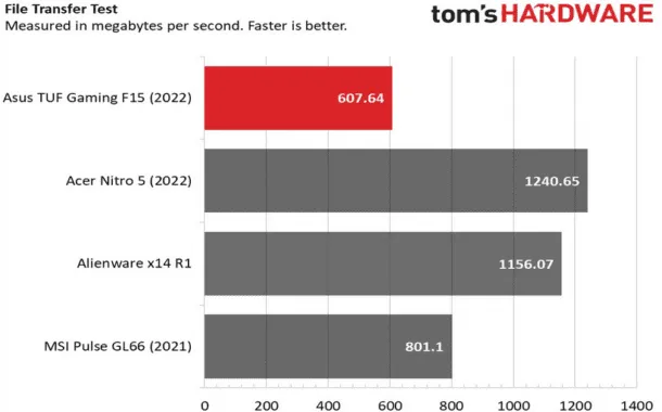 لپتاپ TUF Gaming F15 توانسته ۲۵ گیگابایت فایلهای تست را با میانگین سرعت ۶۰۷.۶۴ مگابایت بر ثانیه منتقل کند. لپتاپ ایسوس در این تست عقب میماند؛ چراکه لپتاپ ایسر سریعترین انتقال اطلاعات را با ۱۲۴۰.۶۵ مگابایت بر ثانیه از خود نشان میدهد. در این تست، آخرین رتبه به لپتاپ Pulse GL66 تعلق میگیرد که با ۸۰۱.۱ مگابایت بر ثانیه کندترین نقل و انتقال را به ثبت رسانده است.