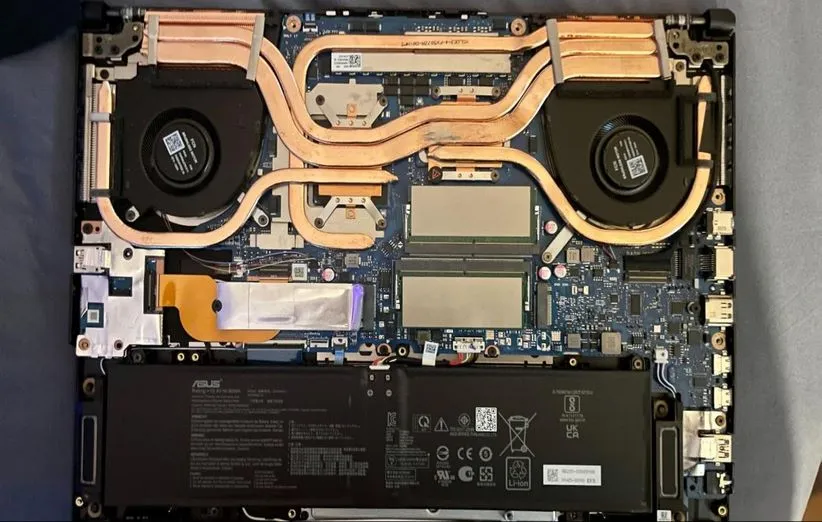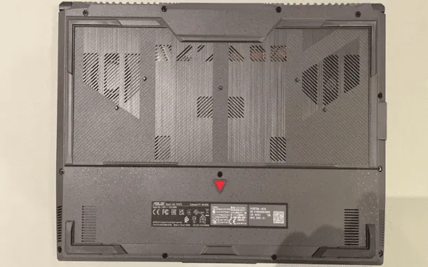 بخش زیرین لپتاپ حاوی ۱۲ پیچ ریز است. این تعداد پیچ را میتوان به راحتی در آورد و برای در آوردن بخش زیرین لپتاپ نیاز به هیچ فشار بسیار زیاد، آن هم با وسیلهی دیگر نیاز نیست. در داخل لپتاپ دو جایگاه رم DDR5 و اسلات SSD وجود دارد. در بخش تحتانی SSD هم باتری ۹۰ وات ساعت (Whr) نصب شده است.