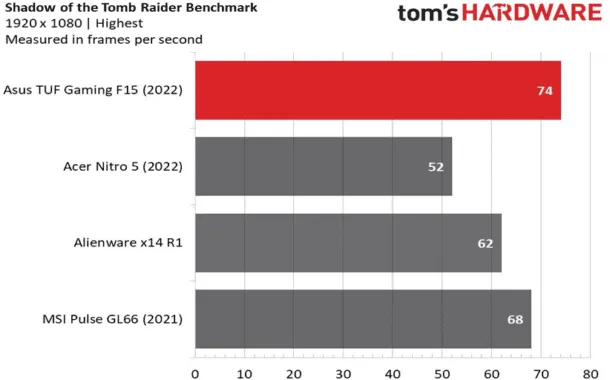 در بنچمارک مربوط به بازی Shadow of the Tomb Raider با بالاترین کیفیت، لپتاپ TUF Gaming F15 توانسته با نرخ فریم پایدار ۷۴ اجرا شود. این موضوع در حالی است که لپتاپ MSI Pulse GL66 نرخ فریم ۶۸ و لپتاپ Alienware x14 R1 نرخ فریم ۶۲ و در نهایت لپتاپ ایسر نیترو ۵ نرخ فریم ۵۲ را کسب کردهاند.