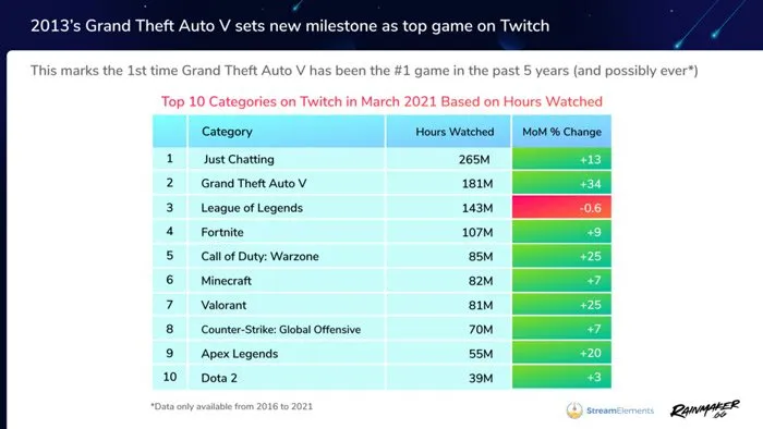 بخواهیم آمار بازدید محتوای استریمشدهی بازیهای مختلف را در نظر بگیریم، در ماه قبل بازی GTA 5 بیشترین آمار را در اختیار داشته و حدود 181 میلیون ساعت بازدید را به خود اختصاص داده است. به دنبال آن، بازی لیگ آو لجندز با 141 میلیون ساعت، فورتنایت با 107 میلیون ساعت، کال آو دیوتی وارزون با 85 میلیون ساعت و در نهایت ماینکرفت با 82 میلیون ساعت، رتبههای بعدی در بیشترین بازدید محتوا را در اختیار داشتهاند.