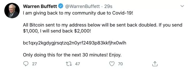 در توییتی که در حساب آقای گیتس ظاهر شد آمده بود: «همه از من می خواهند درآمدهایم را ببخشم و حالا وقتش رسیده. شما هزار دلار بفرستید، من برایتان دو هزار دلار میفرستم.» به غیر از افراد مشهور، حساب کاربری شرکتهایی مانند اپل، اوبر، Cash App هم هک شدند و در این میان باید به هک اکانت افراد مشهور در حوزه رمزارزها هم اشاره کنیم.