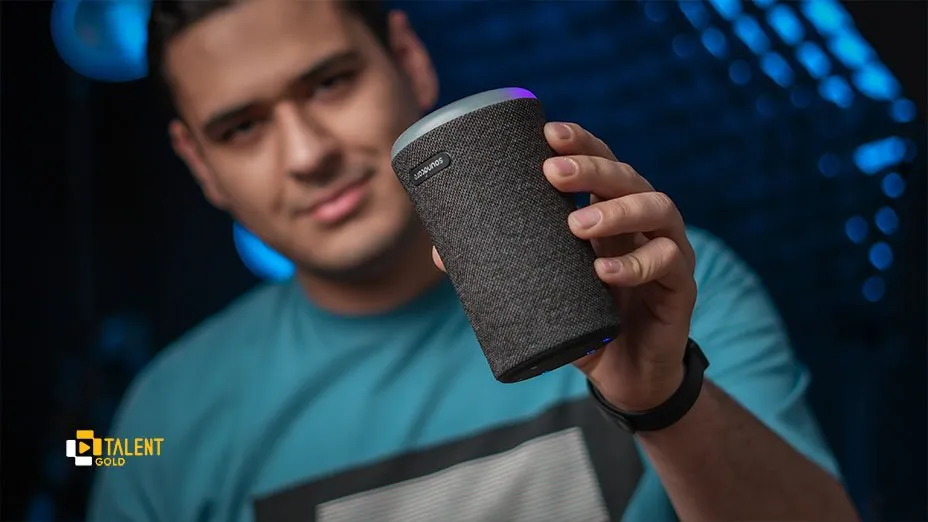 این اسپیکر از طراحی مخروطی شکل بهره میبرد و مبتنی بر بدنهی پلاستیکی است. البته روی بدنه یک پارچه قرار گرفته و به همین خاطر جذابیت طراحی آن افزایش یافته است. زیر اسپیکر یک نوار RGB ارائه شده که نورهای بسیار نرم و جذابی را در اختیار شما قرار میدهد. همچنین با استفاده از اپ ارائه شده، میتوانید افکتهای مختلفی را برای آن انتخاب کنید.