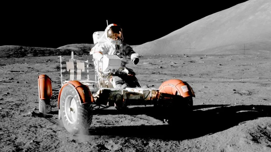یوجین سرنان، فضانورد ماموریت آپولو ۱۷، در حال رانندگی در سطح ماه. Credit: NASA