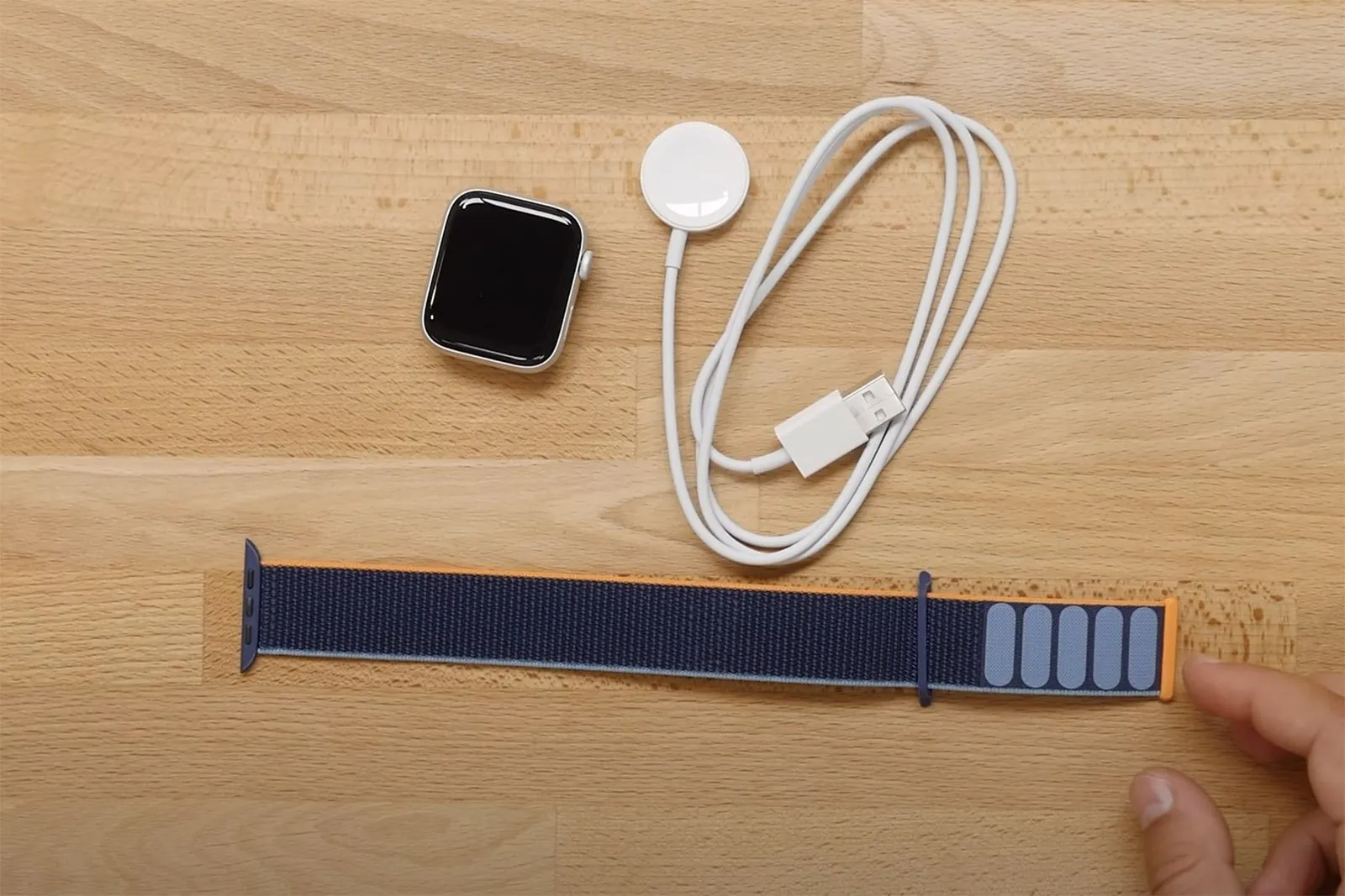 درون جعبهی اپل واچ SE، خود ساعت (از جنس آلومینیوم)، بند و کابل شارژ مغناطیسی اپل (به جای شارژر دیواری) وجود دارد. به جز این موارد، چیز دیگری را درون جعبه شاهد نیستیم و خب انتظاری جز این هم نداشتیم. اپل معتقد است این روزها کاربران به اندازهی کافی شارژر دیواری برای شارژ گوشیها و گجتهای هوشمند خود دارند بنابراین تصمیم گرفته این نوع شارژرها را از جعبهی محصولات خود حذف کند که اپل واچ SE نیز یکی از آنهاست.
