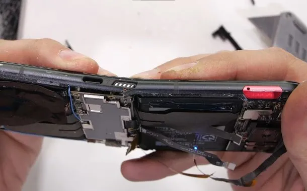 با برداشتن قاب پشتی و مشاهدهی نمایی از داخل گوشی، به خصوص در بخش شکستگی، مشخص شد که دلیل عملکرد ضعیف راگ فون 5 اصلا چیز پیچیدهای نبود اما در عین حال در هیچ گوشی دیگری هم شاهد چنین چیزی نبودیم. طبق توضیحات زک، معمولا در گوشیها یک قطعهی برای جداسازی باتری از برد اصلی وجود دارد که همان هم نقش اساسی در افزایش مقاومت بدنه ایفا میکند و نمیگذارد گوشی مانند آنچه که مشاهده کردیم، بهسادگی بشکند. اما خب راگ فون 5 از پنج بخش تشکیل میشود، دو باتری و سه برد مدار و ظاهرا به همین دلیل هم هست که کلی نوارهای افزایشی را درون گوشی شاهد هستیم.