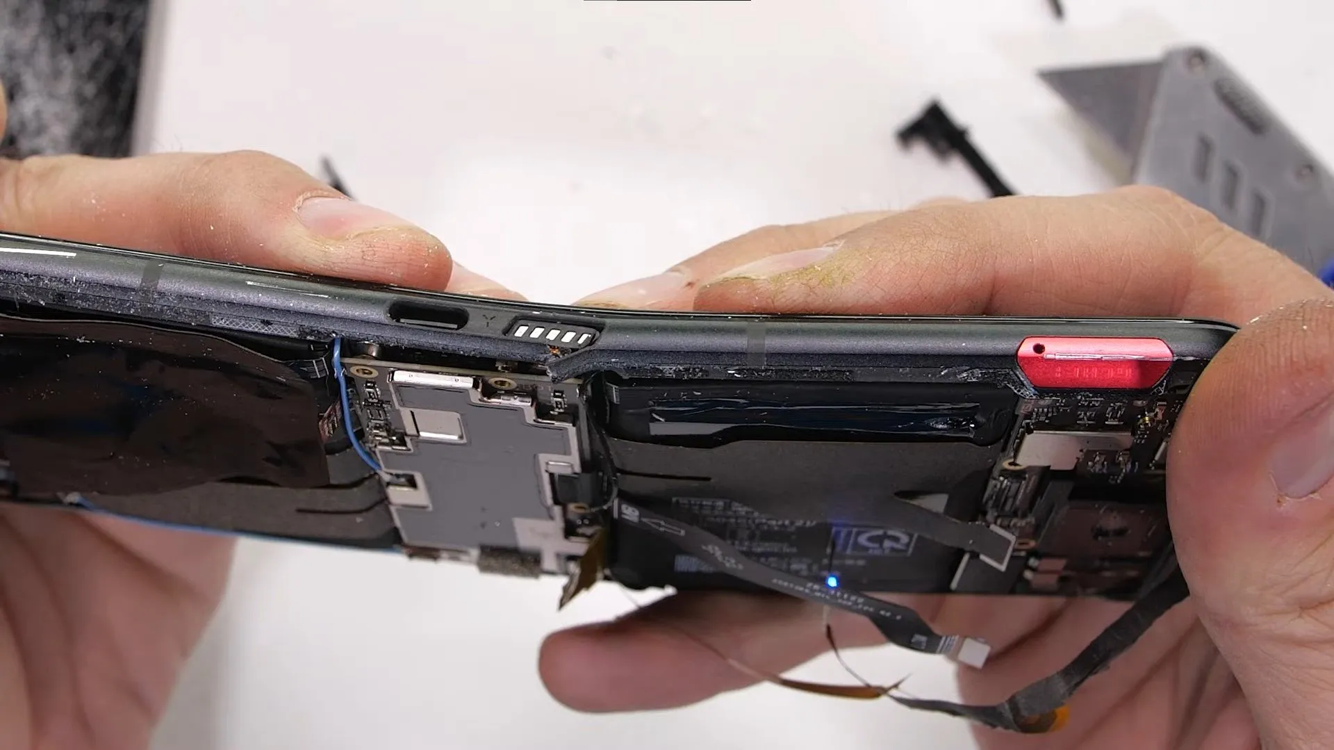با برداشتن قاب پشتی و مشاهدهی نمایی از داخل گوشی، به خصوص در بخش شکستگی، مشخص شد که دلیل عملکرد ضعیف راگ فون 5 اصلا چیز پیچیدهای نبود اما در عین حال در هیچ گوشی دیگری هم شاهد چنین چیزی نبودیم. طبق توضیحات زک، معمولا در گوشیها یک قطعهی برای جداسازی باتری از برد اصلی وجود دارد که همان هم نقش اساسی در افزایش مقاومت بدنه ایفا میکند و نمیگذارد گوشی مانند آنچه که مشاهده کردیم، بهسادگی بشکند. اما خب راگ فون 5 از پنج بخش تشکیل میشود، دو باتری و سه برد مدار و ظاهرا به همین دلیل هم هست که کلی نوارهای افزایشی را درون گوشی شاهد هستیم.
