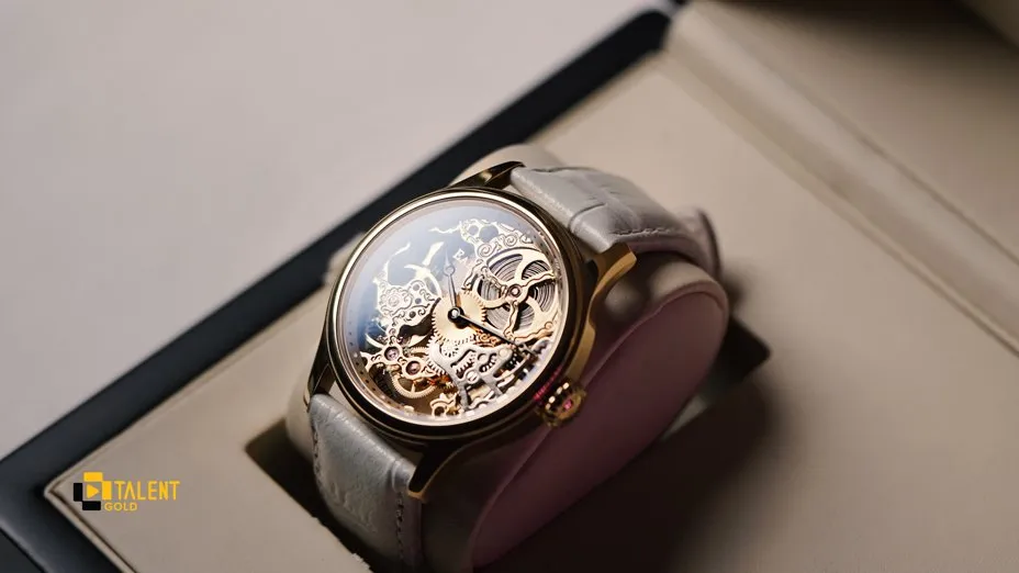 جنس بند این ساعت چرم طبیعی و رنگ آن صدفی است. طراحی بند حالت کهنگی دارد که استایل را کلاسیک میکند. ترکیب رنگ صدفی و قسمتهای فلزی که به رنگ طلایی هستند کاربرد این ساعت را برای استفادههای رسمی و مهمانیها محدود میکند.