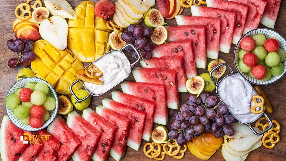 - هر میوهای را که داشتید میتوانید برش دهید و روی تخته سرو بچینید. میوههایی که سیاه میشوند مثل موز و سیب را استفاده نکنید.