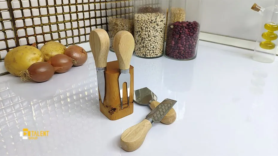 این مجموعه از یک اسلایسر پخش کننده، یک چاقو برای برش پنیر نرم، یک چاقو برای پنیر سخت و یک چنگال تشکیل شده است. تمامی اجزا از ترکیب استیل و دستههای چوبی ساخته شدهاند که ظاهر بسیار جذابی دارند.